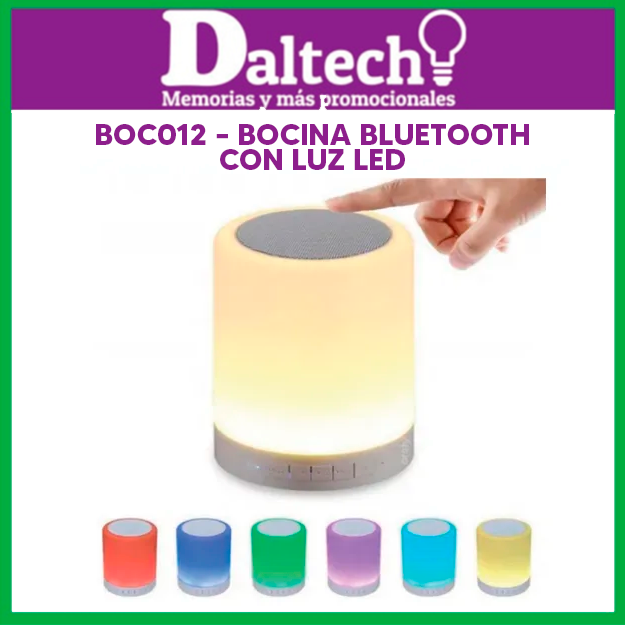 Bocina Bluetooth, con luz LED, cambio de color táctilMultifunción: altavoz bluetooth, luz nocturna, función de lámpara de mesa, color LED. Brillo de 3 intensidades: luz nocturna, luz amarilla cálida, luz blanca cálida. Al mantener pulsado cambia el modo de linterna. Puede usarse como audio para computadoras, radios, MP3 y otros productos electrónicos. Admite conexión Bluetooth, Micro SD, conexión AUX, llamadas manos libres.
