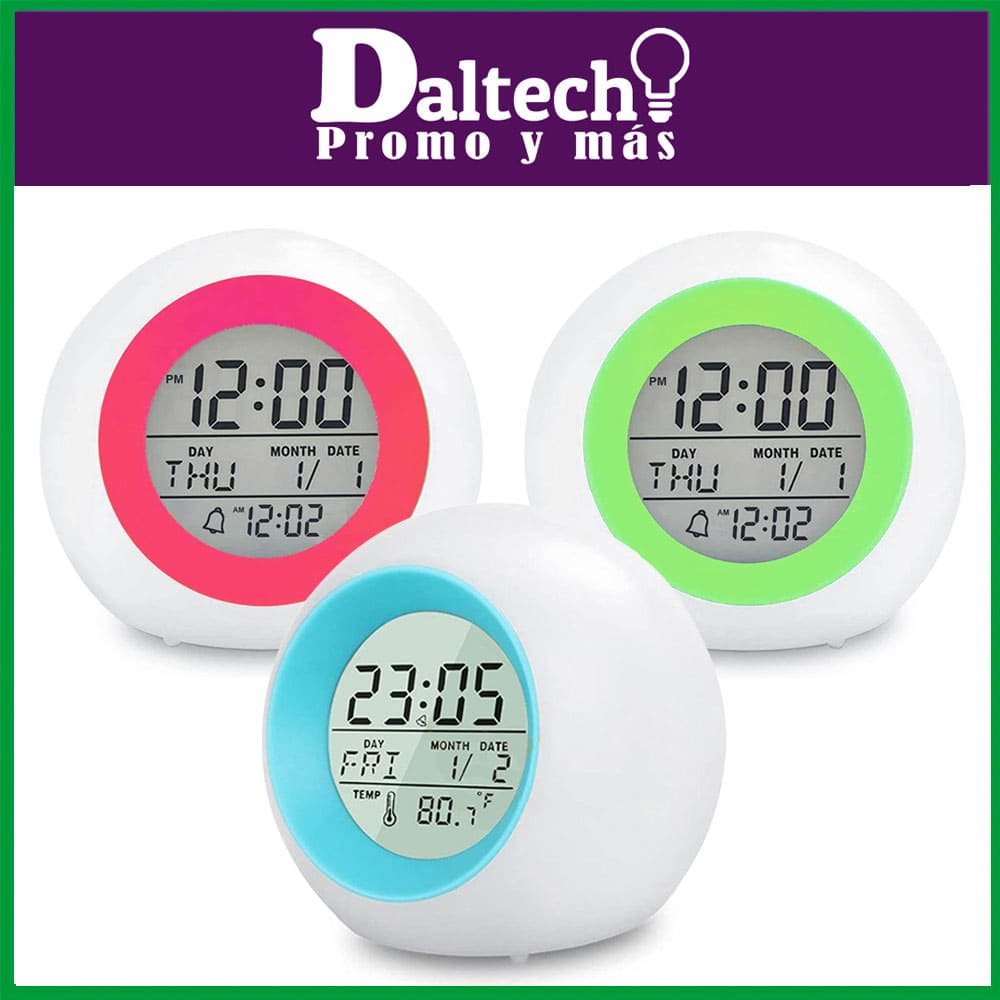 Este despertador tiene 7 luces suaves diferentes. La tecla puede iluminar las luces de siete colores de fondo, las luces de fondo continúan encendiéndose unos 8 segundos. Cuando se reproduce música o el reloj de alarma está en estado, la luz de fondo siempre está encendida en un bucle.Material apto para niñosEl despertador está hecho de material ABS de alta calidad, es seguro para los niños. Puede disfrutar de la tranquilidad mientras los niños usan la pantalla LEDLa pantalla LED muestra la hora, la fecha y la temperatura de forma clara. El formato de 12 horas y 24 horas, junto con la temperatura y Celsius se puede cambiar con un solo toqueAspecto compacto y encantador